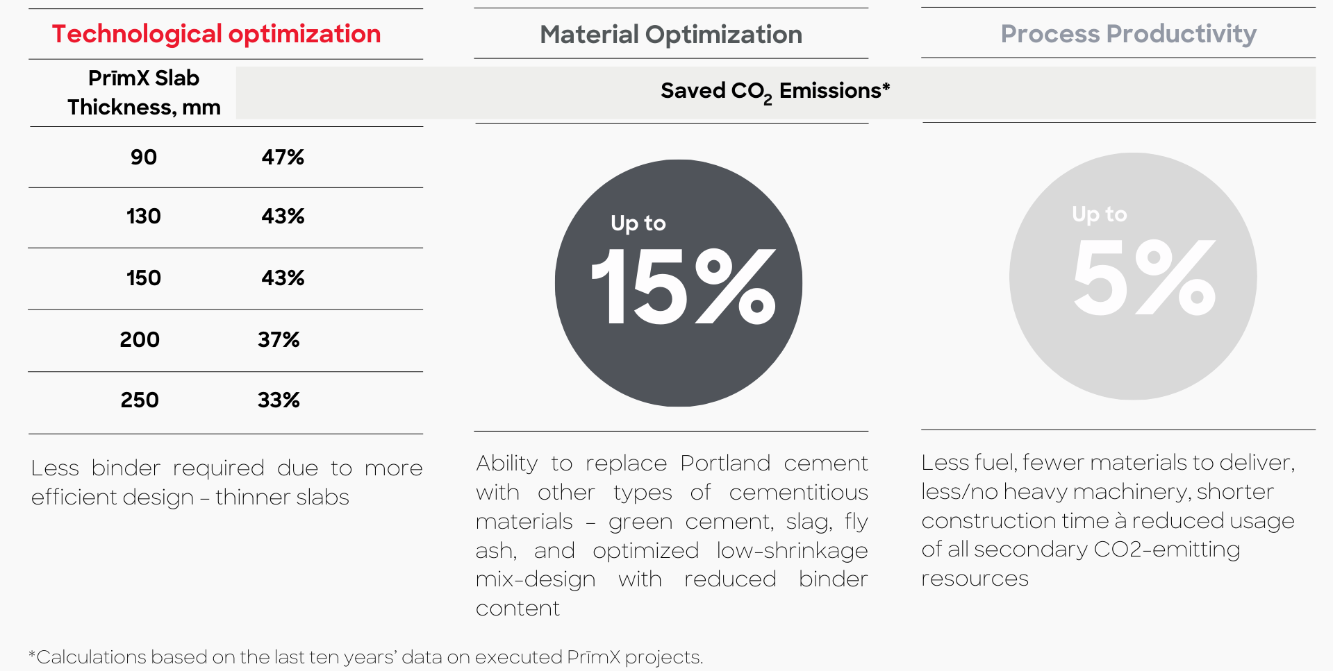 - Thinner slabs and the more efficient PrīmX technology construction process reduce consumption of our limited resources and lower CO2 emissions during construction.